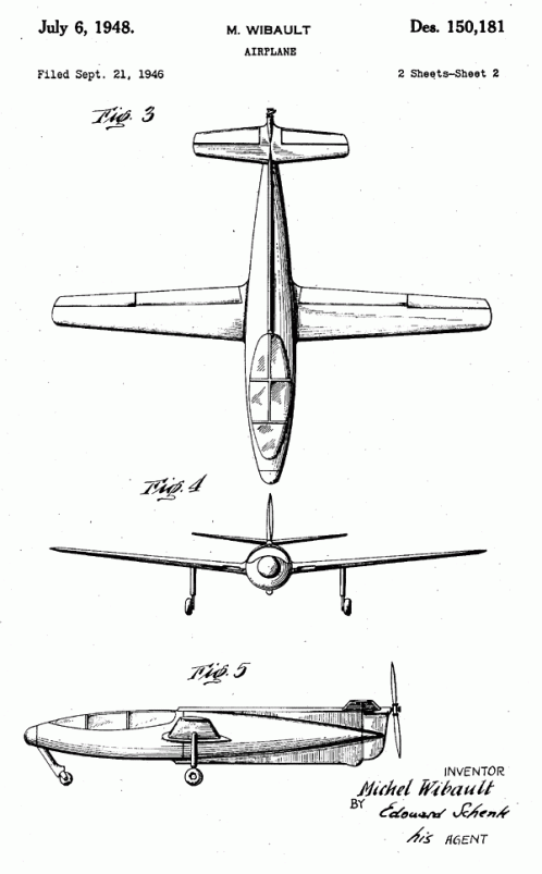 This patent was issued to Michel Wibault in 1948 for this airplane design. "Be it known that Michel Wibault, a citizen of the Republic of France, residing at New York, in the county of New York and State of New York, has invented a new, original, and ornamental Design for an Airplane . . ."