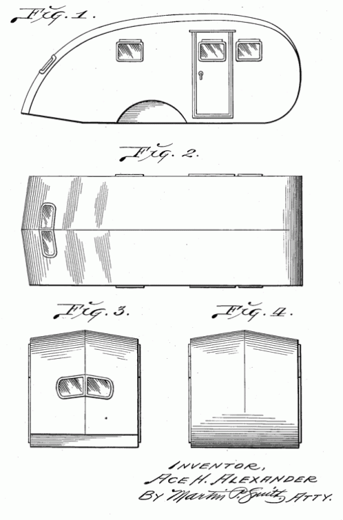 A "design for an automobile trailer body." A classic, teardrop shaped design for a camper. 1936. Invented by Ace H. Alexander.