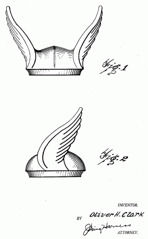 This is another design for a winged radiator cap by Oliver H. Clark. Another version can be seen here. This design was for the Maxwell Motor Corporation, which later became the Chrysler Corporation. 1924. Invented by Oliver H. Clark.