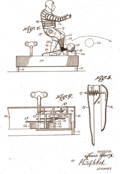 A patent was issued to Louis Marx in 1924 for this mechanical toy football player, which kicks balls queued up at the end of the platform.