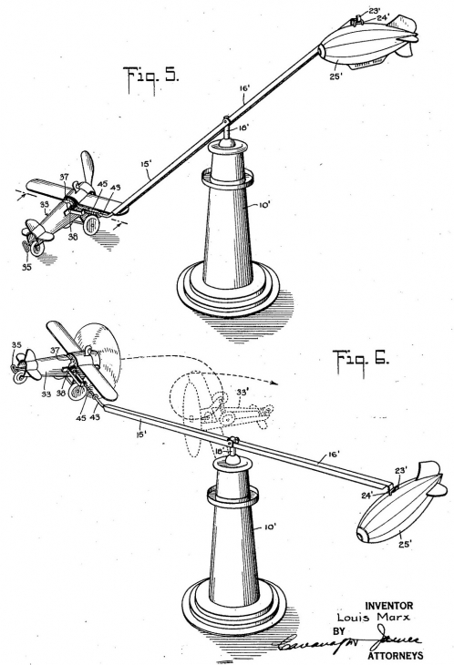 This patent design for a toy airplane that will perform stunts was assigned to the Louis Marx toy company in 1926.