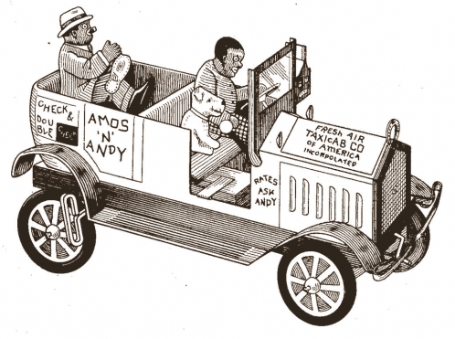 This toy Amos 'n' Andy taxi cab was designed for sale by the Louis Marx toy company in 1930. "Check & Double Check. Fresh Air Taxicab Co. of America Incorpolated. Rates ask Andy." Learn more about Amos 'n' Andy. You can see a photo of the actual toy here.