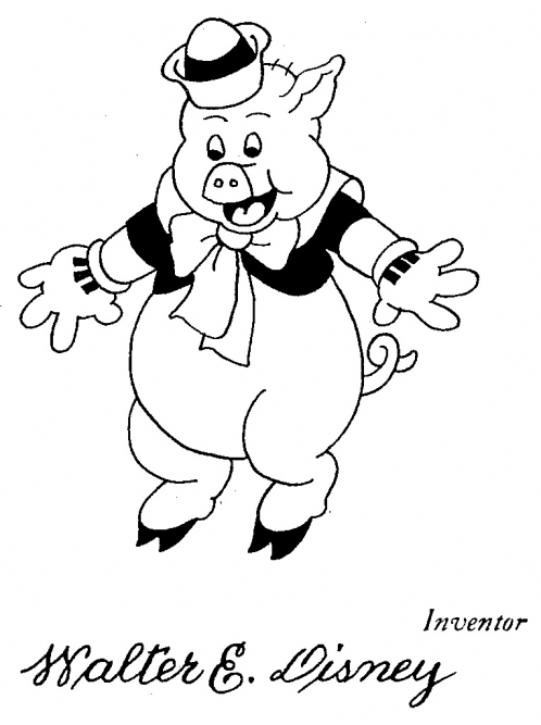 A design patent was issued to Walt Disney in 1934 for this drawing of a pig. The pig is one of the characters in the Disney animated short film Three Little Pigs.
