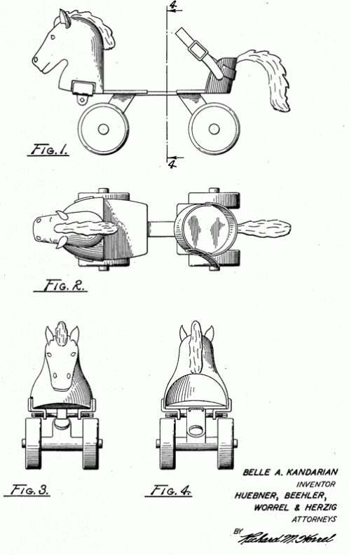 A bucktoothed child's riding toy. On a stick. 1953. Invented by Milburn R. Hutchison.