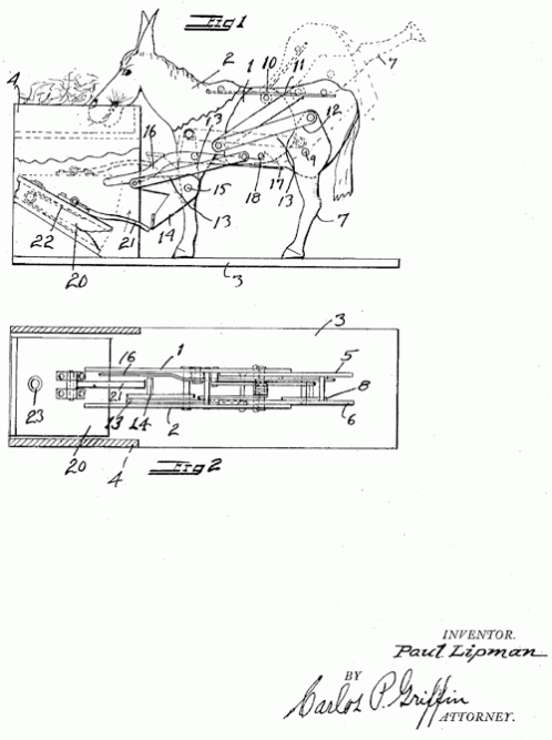 A mechanical kicking mule. Air slowly returning to the bellows (20) will, after about 30 seconds, strike the end of the hook lever (16) causing the mule to kick. 1924. Invented by Paul Lipman.