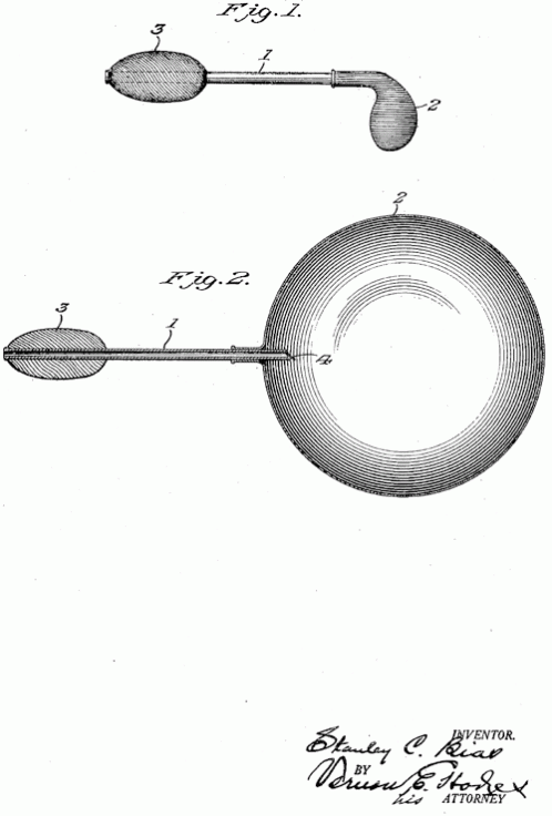 This toy consists of a tube with a balloon on one end and a confection on the other end. The tube is constructed to give a sound, somewhat like a flute, when the child places the end with the confection in his mouth and blows through to inflate the balloon, or when the balloon is deflated. 1924. Invented by Stanley C. Bias.