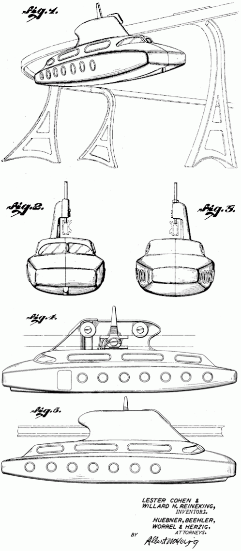 Let your imagination ride aboard a brand new concept in transportation. A design for a toy monorail. 1953. Invented by Lester Cohen and Willard H. Reineking.