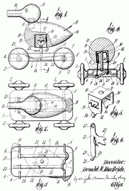 Moving figure toy. A twisting, waddling duck. 1931. Invented by Donald H. MacBride.