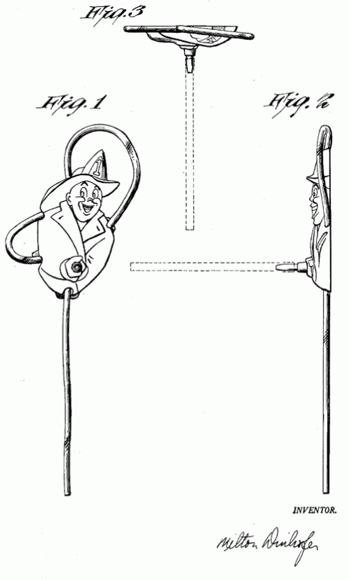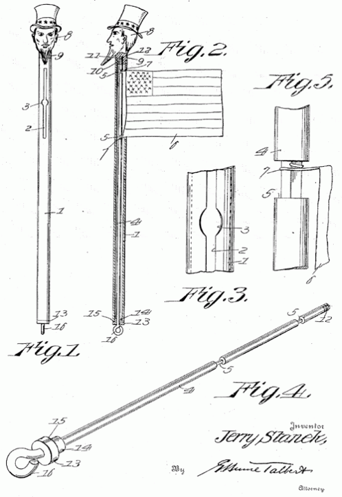 A toy design for a retractable flag. "It is an additional object of this invention to provide a head on the inner rod which will rotate therewith when the flag is being actuated." 1920. Invented by Jerry Stanke.