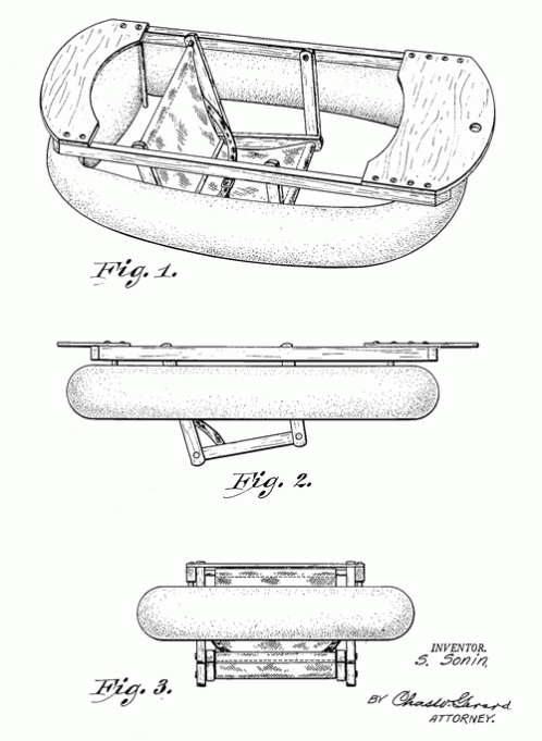 A "float boat for children." Children can be safely strapped in and towed by a line attached to the bow. 1952. Invented by Sam Sonin.