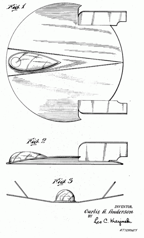 A design for a flying toy airplane inspired by the Johnny Hazard comic series of the 1950s. 1953. Invented by Curtis A. Anderson.