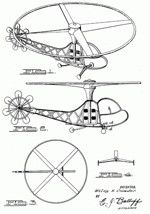 A design for a toy helicopter. 1950. Invented by Wiley K. Crowder.