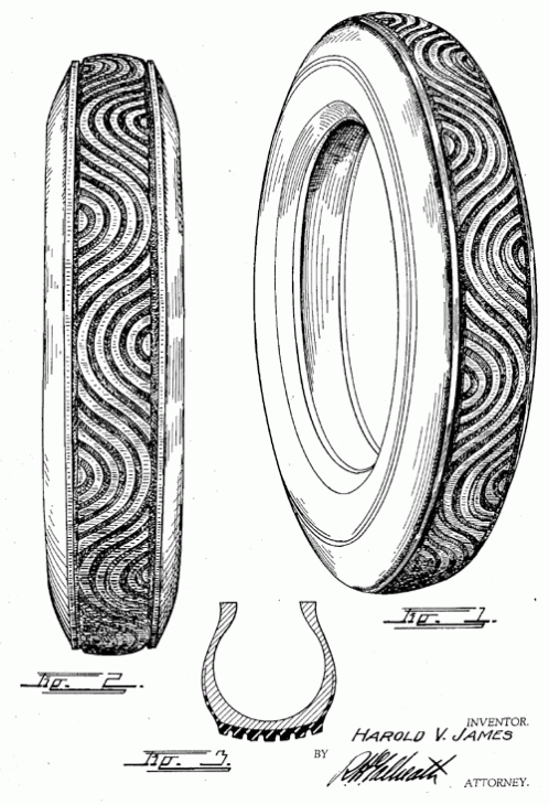 Tire. A graceful tread design. 1938. Invented by Harold V. James.