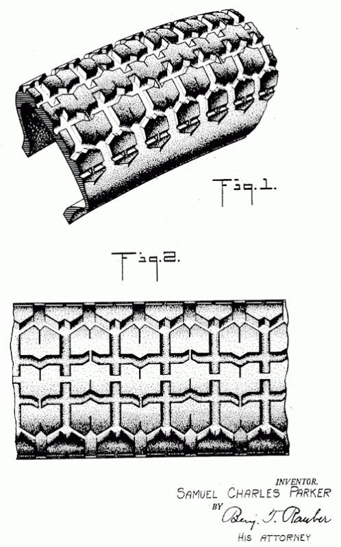 An ornamental design for a tire tread. 1951. Invented by Samuel Charles Parker.