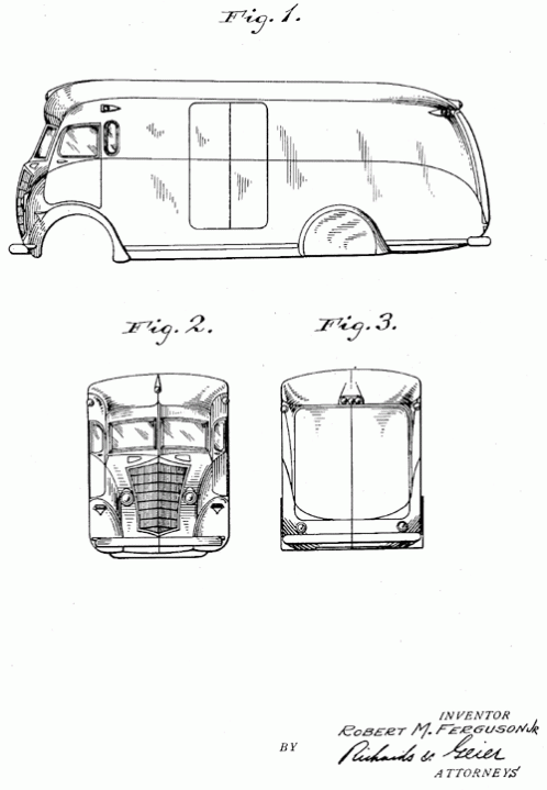 A body design for a windowless van. 1936. Invented by Robert M. Ferguson Jr.