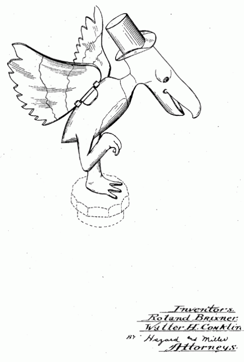 An ornamental design for an automobile radiator ornament. 1926. Invented by Roland Brixner and Walter H. Conklin.
