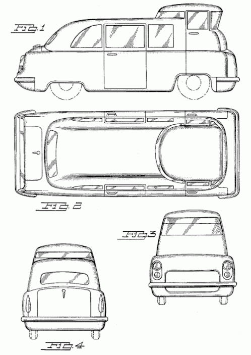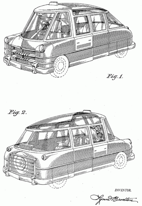 A fantastic taxi cab design. The driver sits front and center and passengers enjoy views in all directions including up, through a glass roof. 1954. Invented by Lynn Brodton.