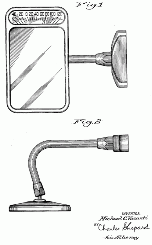 A combined thermometer and rear-view mirror for use on motor vehicles. The patent was assigned to the Germanow-Simon Machine Company of Rochester, N.Y. 1951. Invented by Michael C. Vacanti.