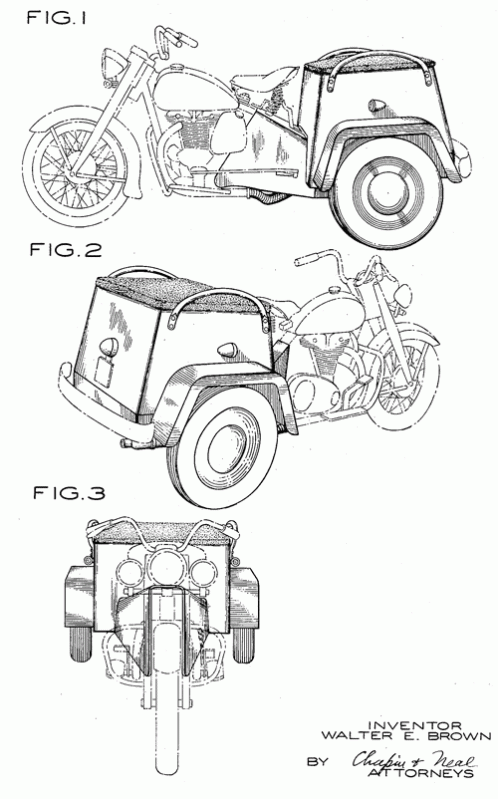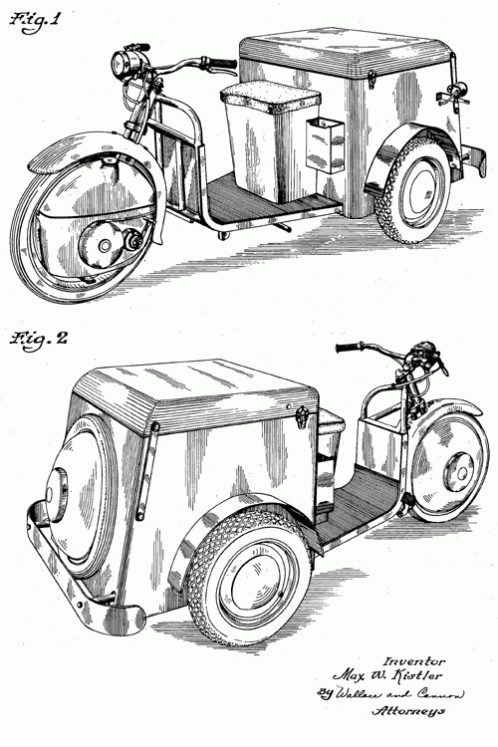 A three-wheeled design with a storage trunk assigned to The Indian Company of Delaware. 1954. Invented by Walter E. Brown.