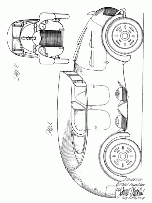A rhino-nosed design for an automobile body. 1921. Invented by Ernest Rapattoni.