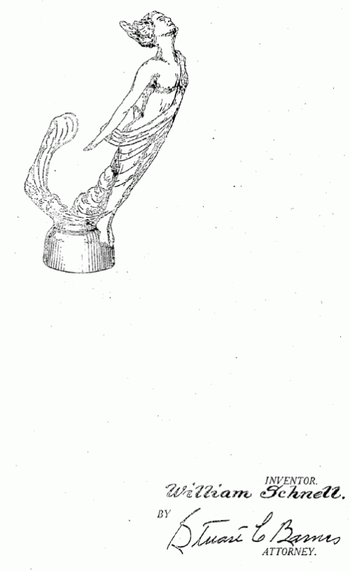 William Schnell had another design for a radiator ornament that was used on the 1931 Pierce-Arrow and of course this patent design. This design was assigned to Ternstedt Manufacturing Company, which made auto body hardware and was acquired by General Motors in 1926. 1926. Invented by William Schnell.