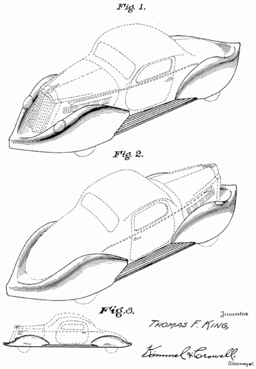 A two-door car that appears to be parting the waves. 1939. Invented by Thomas F. King.