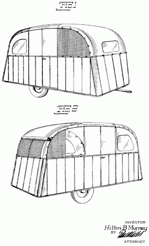 A hard-top camper with detachable faces to let the breeze in. 1936. Invented by Hilton B. Murray.