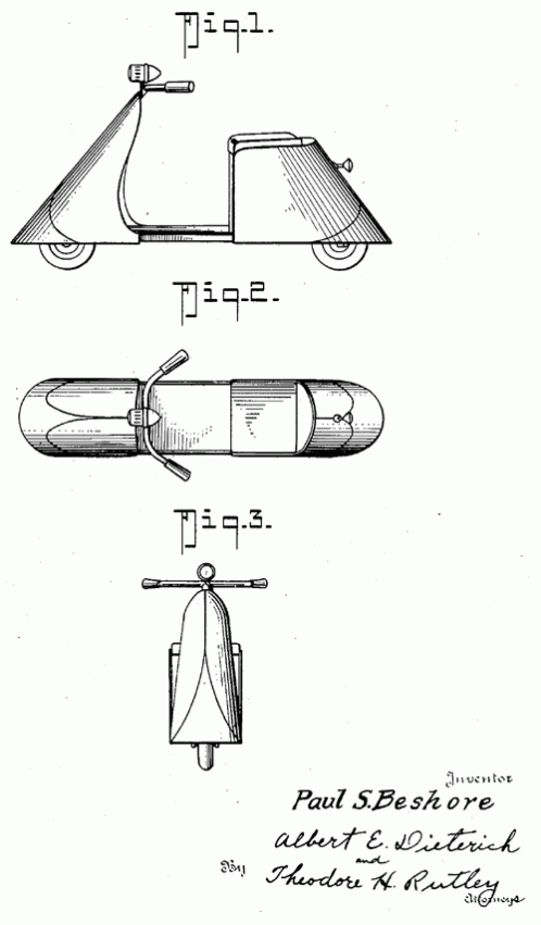 A motor scooter for a youth. 1939. Invented by Paul S. Beshore.