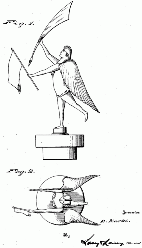 A winged, flag waving warrior mascot. I don't believe this was manufactured. If you know differently, please leave a comment. 1926. Invented by Richard Karki.