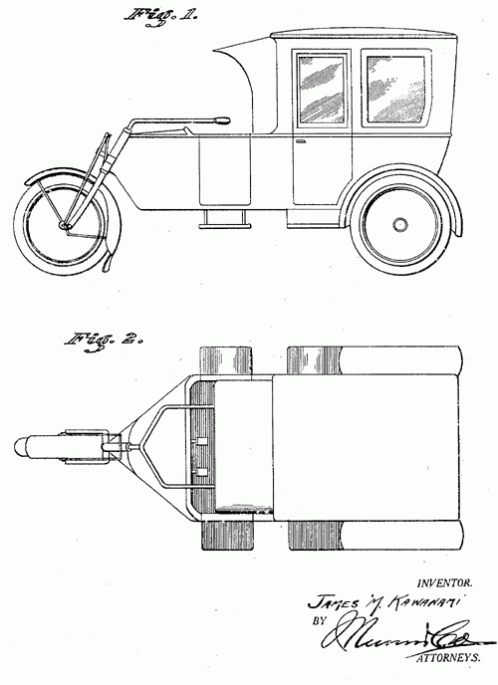 A tri-wheeled automobile design by James Masayuki Kawanami, a "subject of the Emperor of Japan." 1921. Invented by James Masayuki Kawanami.