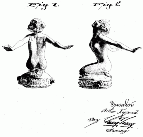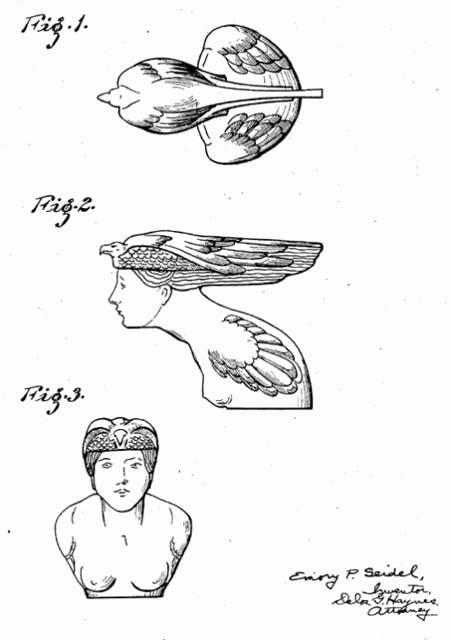 A radiator ornament of a winged woman in a bird headdress. 1926. Invented by Emory P. Seidel.