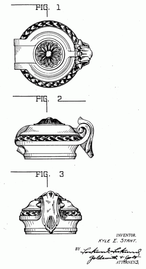 A highly ornamental design for a radiator cap. 1928. Invented by Kyle E. Stant.