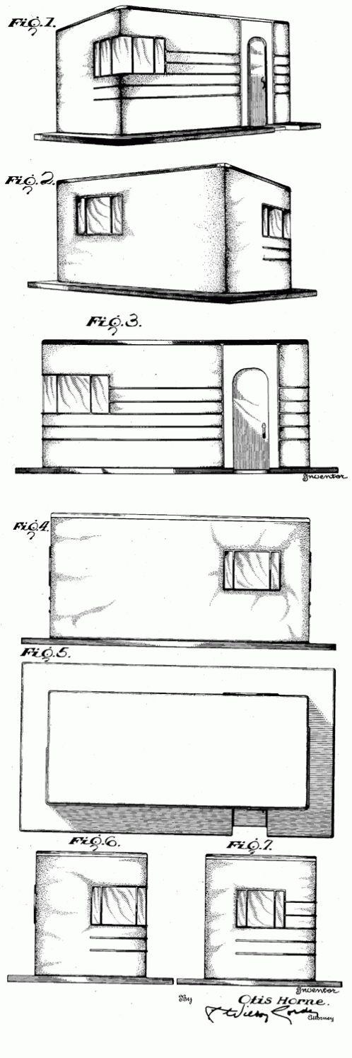 An ornamental design for a tiny building. Everyone gets a corner office. 1939. Invented by Otis Horne.