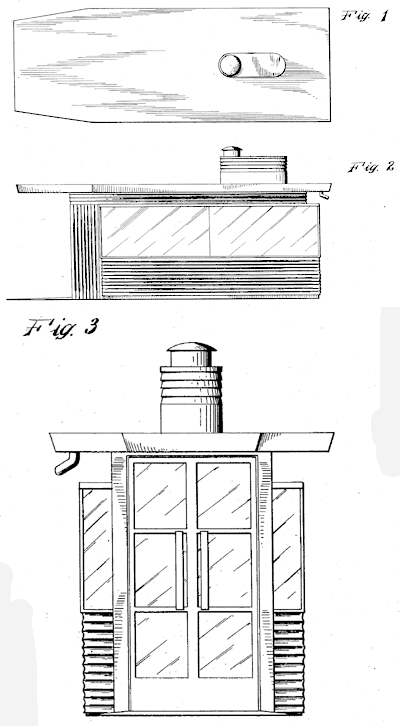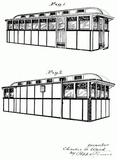In the 1920s and 30s the Ward & Dickinson Co. built diner cars and sold them throughout the Great Lakes Region. A version of the diner body shown in this patent is still in operation as the Miss Port Henry Diner in Port Henry, N.Y. 1927. Invented by Charles A. Ward.