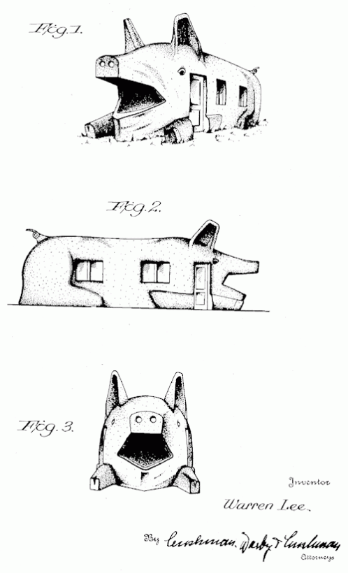 Refreshment building. Nothing says quality dining like a yawning pig. 1934. Invented by Warren Lee.