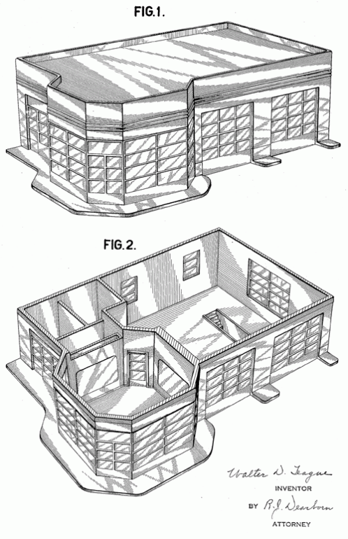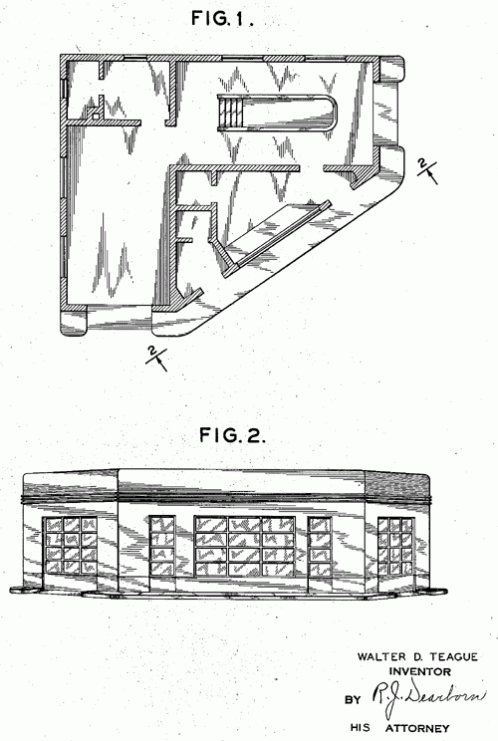 A gas station design for Texaco by Walter D. Teague, a pioneer of industrial design who was responsible for the roadside look of Texaco in the 1930s. 1936. Invented by Walter D. Teague.