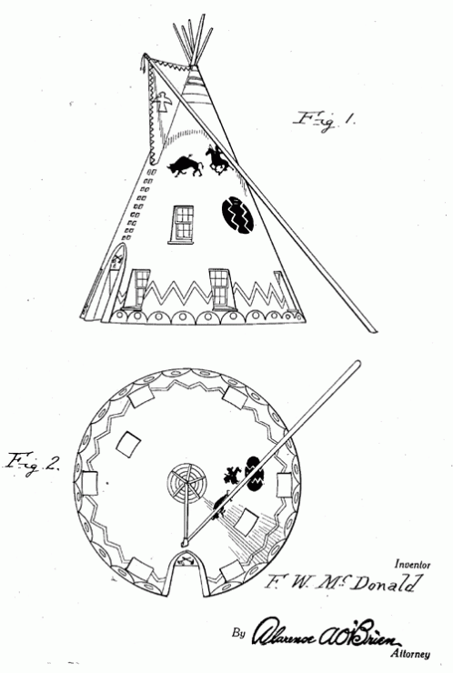 A teepee design for a roadside building. 1930. Invented by Frank W. McDonald.