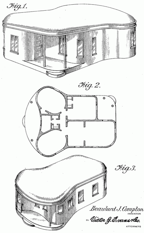 A pre-war design for a steel house. While a steel house may seem unusual, following WWII about 2,500 steel Lustron Homes were built to help alleviate a housing shortage. Owners of the homes enjoyed their durability and easy maintenance. 1939. Invented by Beaulard J. Compton.