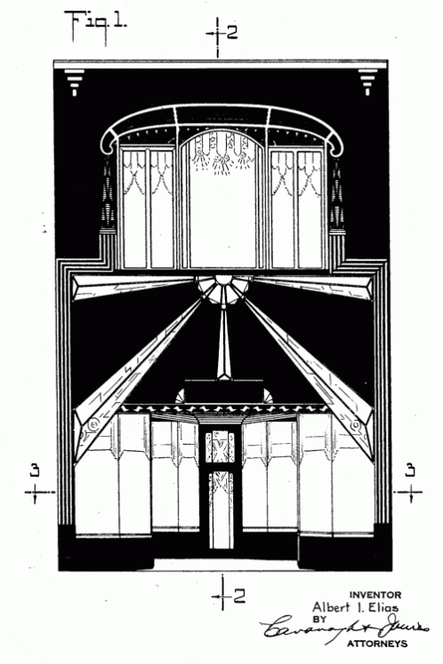 A highly-decorative design for a store front, perhaps for selling jewelry. 1931. Invented by Albert I. Elias.