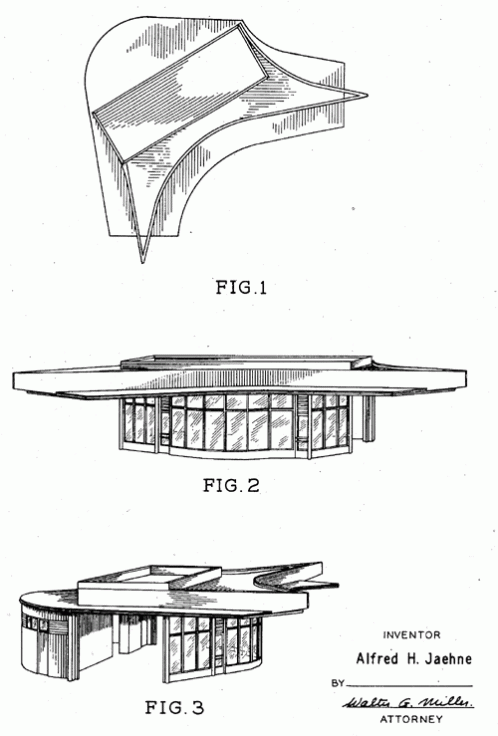 A piano shaped design for a gas station with what appears to be a tiny bay. 1941. Invented by Ralph N. Aldrich and Alfred H. Jaehne.
