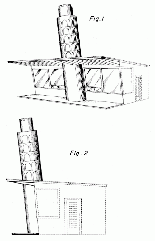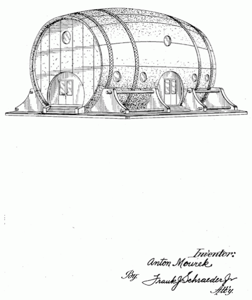 The patent says this could be used as a display building for fairs, an amusement building, dancing pavilion or a restaurant or refreshment building. But it's clearly a building design that would inspire college students. 1934. Invented by Anton Mourek.