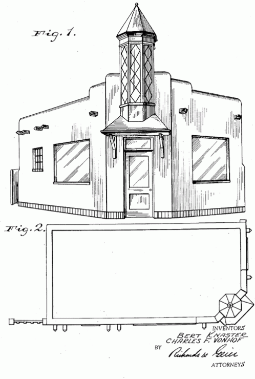 An ornamental design for a corner storefront. 1935. Invented by Bert Knaster and Charles F. Vonhof.