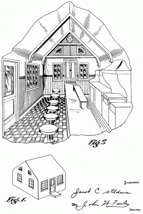 A design for a road-side lunch house. 1933. Invented by Jacob C. Stedman.