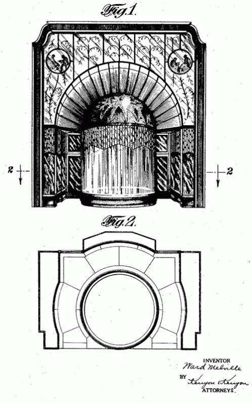 A highly ornamental design for a store front for the Melville Shoe Corporation of New York. The inventor, Ward Melville, ran the shoe company and was involved in many philanthropic projects in New York. 1928. Invented by Ward Melville.