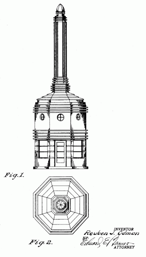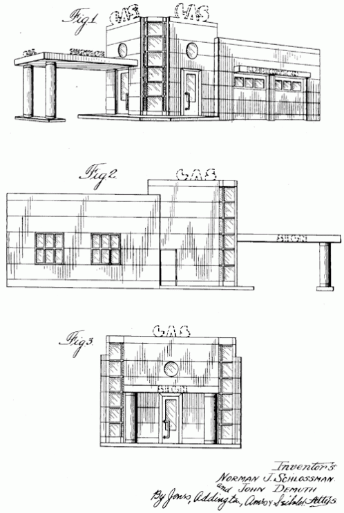 A service station for motor cars. 1934. Invented by Reuben J. Odman.