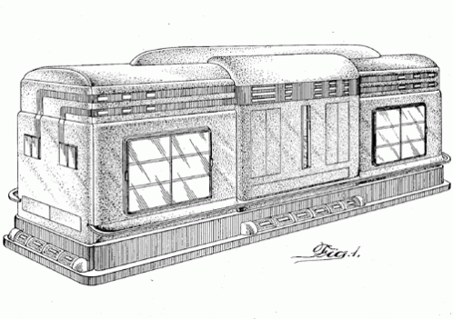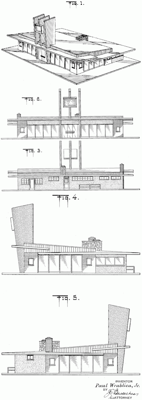 A design for a roadside restaurant with Googie-style architecture. 1951. Invented by Paul Wrablica Jr.