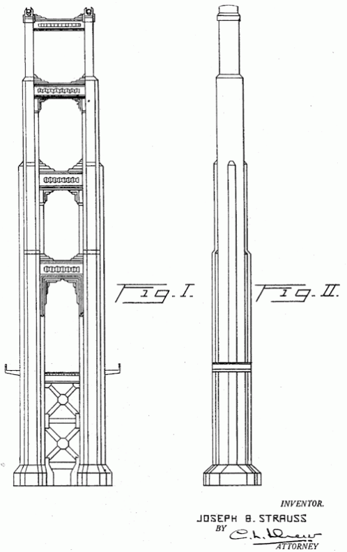 J. B. Strauss designed the Golden Gate Bridge and received a patent for this ornamental bridge pier. When completed in 1937 the Golden Gate was the world's longest bridge. 1932. Invented by Joseph B. Strauss.