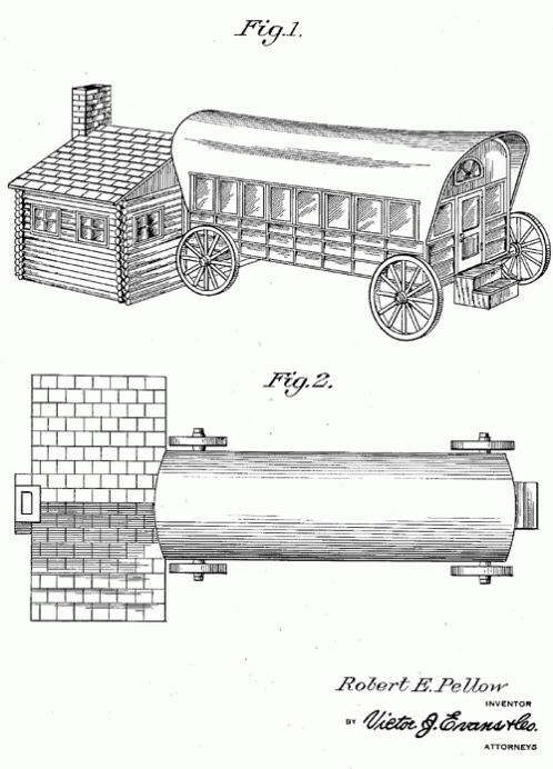 A log cabin with a chuck wagon for a front door. 1936. Invented by Robert E. Pellow.