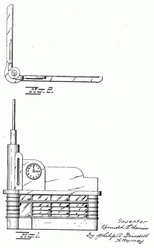 An art deco facade with time and temperature. 1940. Invented by Kenneth E. Bemis.