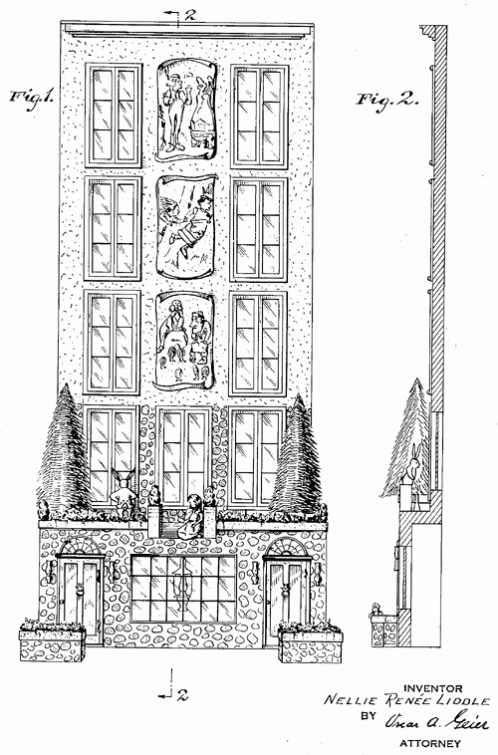 A design for the front of a club house or similar building. Note the rabbit in a jacket peeking in the second story window. 1934. Invented by Nellie Renee Liddle.